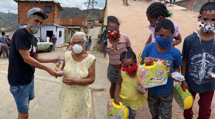 Una foto que circula por las redes sociales muestra a Carlos Luis Revette, alias «El Coqui» con una cerveza en la mano, mientras le entrega una arepa envuelta en papel de aluminio a una anciana. El líder de la banda criminal de la Cota 905 posa para la foto y la mujer toma el alimento, como si de una campaña política se tratara.