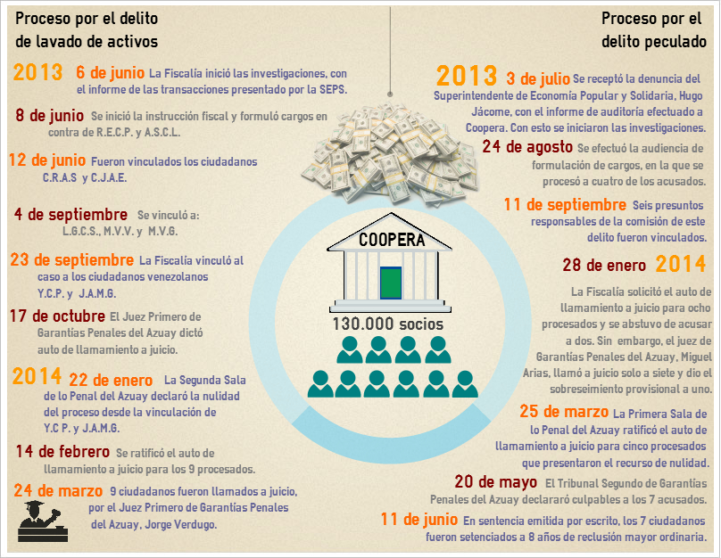 Las pruebas obtenidas por la Fiscalía General de Ecuador, en un año de investigación, permitieron evidenciar que en la cooperativa de ahorro y crédito Coopera se cometieron delitos de peculado y lavado de activos. Esto llevó a su cierre en junio del 2013, cuando contaba con alrededor de 130.000 socios.