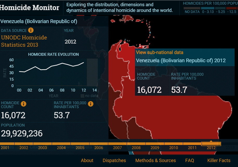 Los datos corresponden al Monitor de Homicidios del Instituto Igarapé de Brasil, una aplicación tridimensional que muestra la expansión mundial de los asesinatos. Se trata de una herramienta del Instituto Igarapé de Brasil. A través de ella, se puede conocer la situación de los países sobre este tema que tanta preocupación causa en todos los países