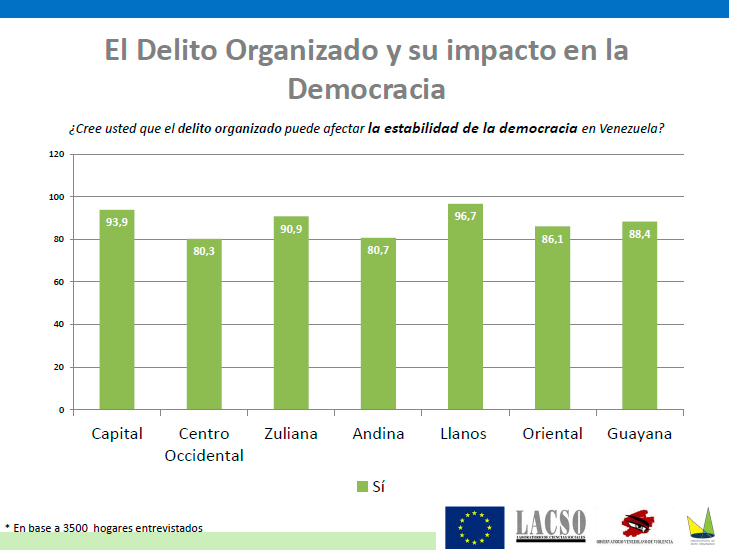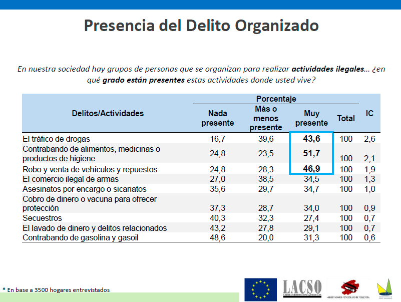 Roberto Briceño León, representante de LACSO, destaca varias conclusiones importantes sobre los resultados de la encuesta: La primera es que el  delito organizado está presente en todo el país, aunque de manera desigual. La segunda es que la encuesta atribuye el delito organizado a la delincuencia común, a las mafias, a los pranes en las cárceles, pero no a la guerrilla ni a los paramilitares. Considera además que los militares han sido corrompidos por el narcotráfico.