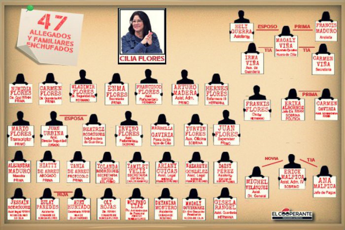 La primera dama de Venezuela, Cilia Flores es tan conocida por ayudar a que sus familiares consigan puestos en el gobierno que la detención de dos de sus sobrinos con cargos de drogas de Estados Unidos ha dado lugar a una broma en círculos de la oposición: «No todos los de su familia puede trabajar en la Asamblea Nacional.»
