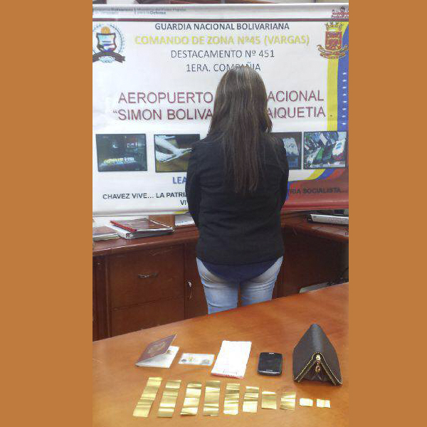La detenida quedó identificada como Lizbeth Amarillo Sánchez, quien se disponía a abordar el vuelo con destino a la ciudad de Lima,Perú. Al momento de la revisión  personal se rehusaba a ser chequeada, pero cuando el procedimiento se hizo efectivo le encontraron las 10  láminas de oro en el bolsillo del pantalón, con un peso de  273 gramos, por lo que fue puesta a la orden de la  Fiscal 12° del Ministerio Publico de la Circunscripción Judicial Penal del estado Vargas.