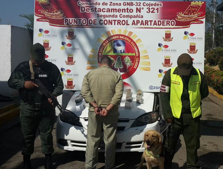 Efectivos militares de la Unidad Regional de Inteligencia Antidrogas N° 32 Cojedes, de la Guardia Nacional Bolivariana, en conjunto con efectivos adscritos a la Segunda Compañía del Destacamento N° 321, en el Punto Control Fijo “Apartamentos”, ubicado en la Autopista José Antonio Páez efectuaron la detención preventiva de un ciudadano con 8 kilos de presunta droga.