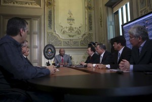El presidente de la Asamblea Nacional, Henry Ramos Allup, informó en el programa La Fuerza Es La Unión, conducido por el secretario ejecutivo de la Unidad, Jesús Chuo Torrealba, que el parlamento se negó a la propuesta que le hizo el vicepresidente Istúriz de que los legisladores acudieran a Miraflores a escuchar a los ministros, tras la negativa a comparecer en el hemiciclo. En la imagen, el vicepresidente, Aristóbulo Istúriz reunido con el gabinete económico, el pasado jueves. Foto suministrada por Reuters