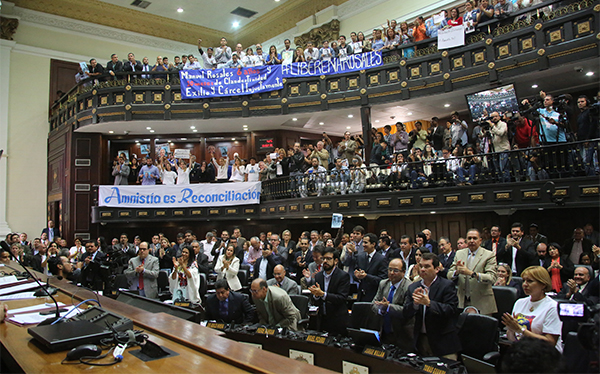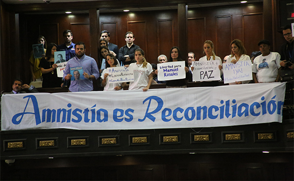 El proyecto de Ley de Amnistía y Reconciliación Nacional presentado a la plenaria de la Asamblea Nacional, por la bancada de la Mesa de Unidad Democrática (MUD), establece que solo quedan exceptuados de la amnistía otorgada por este instrumento jurídico, los crímenes de guerra, y los delitos de lesa humanidad o delitos relativos a violaciones graves a los derechos humanos por autoridades o funcionarios públicos.