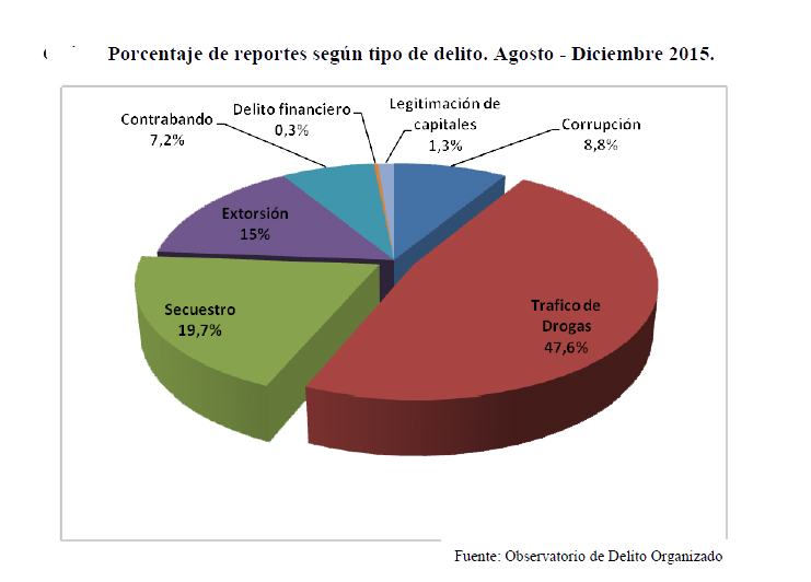 El tráfico de drogas aparece como el delito más frecuente, con 150 reportes noticiosos válidos, durante el tiempo del análisis. Seguido por el secuestro, con 63 reportes. La extorsión se ubica en tercer lugar con 48 (15%), luego 28 casos de corrupción (8,8%), 23 hechos de contrabando, cuatro (4) de Legitimación de capitales y un delito financiero.