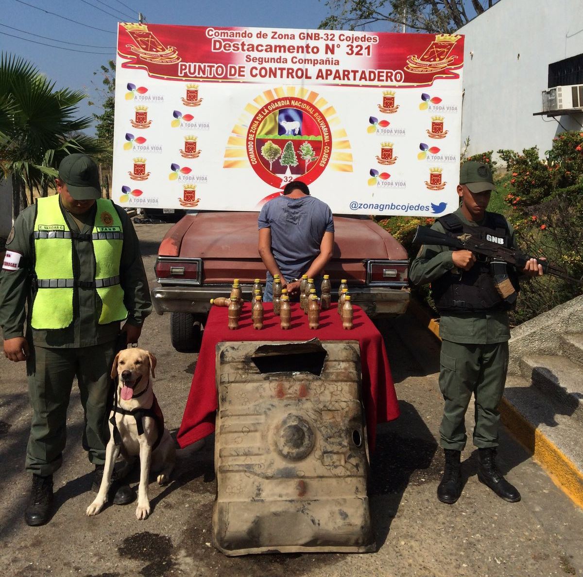 “Posterior de haber marcado la zona donde se encontraba oculta la droga, los centinelas procedieron a chequear el tanque de combustible del carro, avistando 19 botellas plástica, 10 de ellas con el contenido de presunta cocaína y 9 con hiervas de la denominada marihuana” precisó Fraino Arellano.