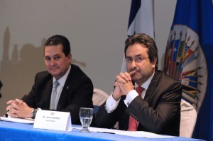 La Comisión de Apoyo Contra la Corrupción y la Impunidad en Honduras (MACCIH), similar a una existente en Guatemala y que tendrá como coordinador al abogado peruano Juan Jiménez Mayor, fue presentada en una ceremonia con asistencia de decenas de funcionarios, miembros de la sociedad civil y del cuerpo diplomático.La OEA instaló este lunes en Tegucigalpa una comisión que ayudará al gobierno de Honduras a combatir la corrupción y la impunidad, mediante un nuevo cuerpo de jueces, fiscales y policías para el “desmantelamiento de las redes” del crimen organizado. En la imagen, El secretario para el Fortalecimiento de la Democracia de la Organización de Estados Americanos (OEA), Francisco Guerrero (izq.), y el portavoz de la Misión de (MACCIH. Juan Jimenez. Foto AFP.