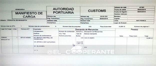 Además de estas cantidades, un manifiesto de embarque de Air France muestra que otros 12. 561 kilogramos de barras de oro fueron sacados de Venezuela el 8 de marzo, es decir, al menos otros 500 millones salieron del país.