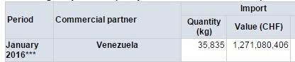 En términos generales, la introducción de oro a Suiza se ha incrementado fuertemente. Cuatro grandes refinerías helvéticas se encargan de 70% del oro producido a nivel global. La importación de oro desde Venezuela creció enormemente en enero. El momento de la entrega sugiere que Venezuela usará el dinero en efectivo para pagar una porción significante de la deuda emitida en bonos. El Estado venezolano tuvo que pagar 1,5 mil millones de dólares a sus prestamistas el 26 de febrero.