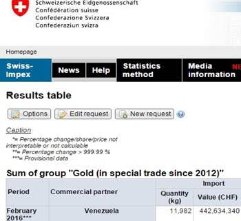 Según el Informe Federal Suizo de la Administración de Aduanas, dado a conocer hoy, Venezuela envió 11.982 kilogramos de oro por valor de 456 millones de dólares a Suiza en febrero.