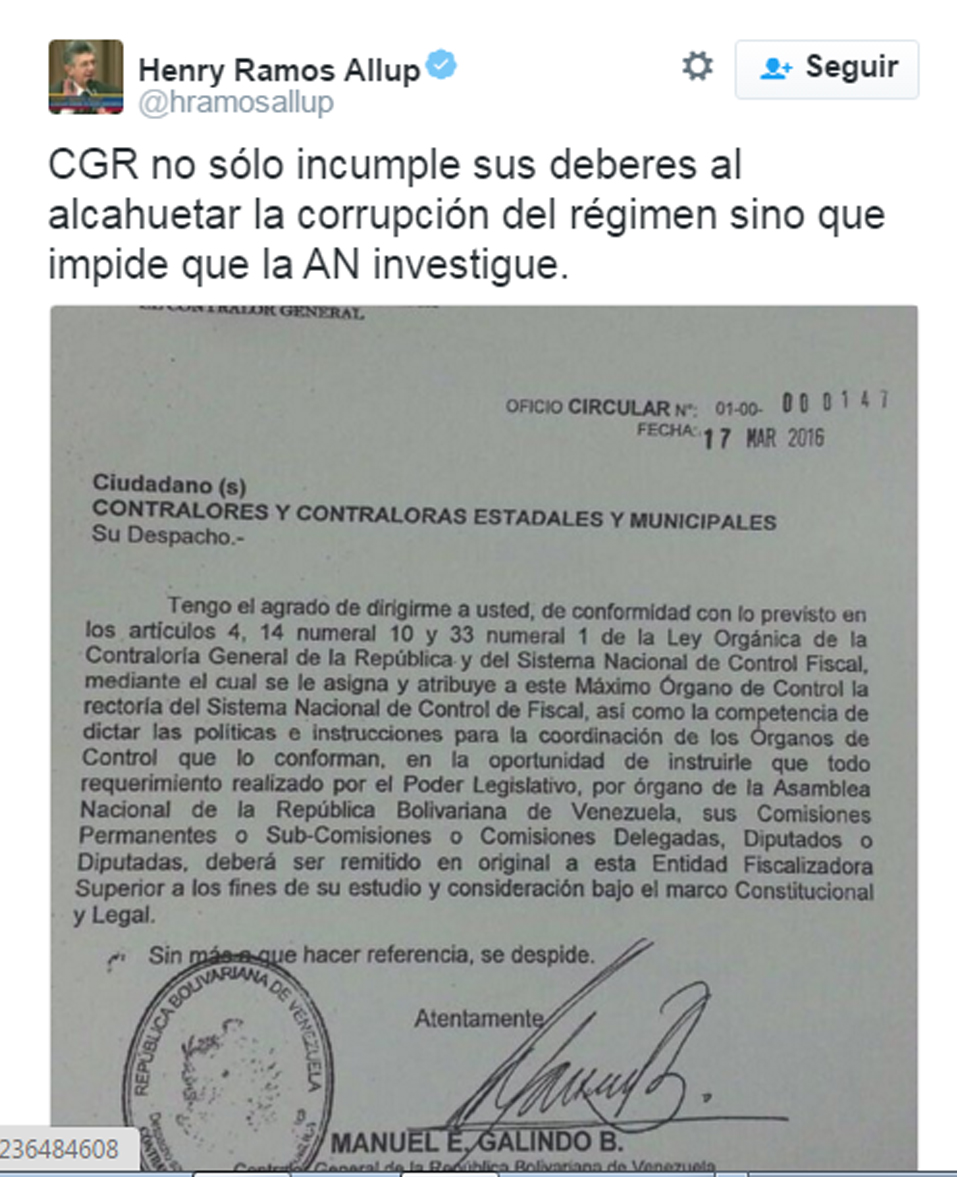 En desacuerdo con la circular emanada de la Contraloría General de la República, se mostró el presidente de de la Asamblea Nacional, Diputado Henry Ramos Allup, quien a través de su twitter: @hramosallup, aseveró que la CGR no sólo incumple sus deberes al alcahuetar la corrupción del régimen sino que impide que la AN investigue. “.