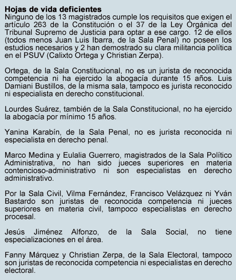 Carlos Berrizbeitia, presidente de la comisión parlamentaria que evaluó el proceso, afirmó que el baremo para la selección de los candidatos a magistrados no se escogió con el voto de las dos terceras partes de los diputados, como exige el artículo 73 de la Ley Orgánica del TSJ.