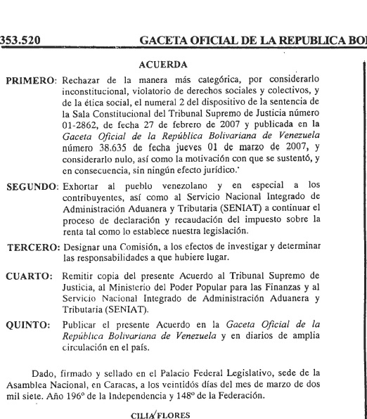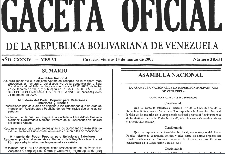 La decisión de la Asamblea Nacional fue publicada en la Gaceta Oficial del 23 de marzo de 2007.