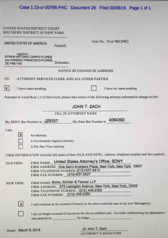 Otro cambio. Desde la pasada semana se escucharon comentarios de la posibilidad de pedir una nueva prórroga motivado a la falta de tiempo para evaluar las evidencias. El viernes 18 de marzo se conoció que Efraín Campos Flores decidió hacer nuevos cambios en su defensa, incorporando a dos célebres litigantes, que fueron por años fiscales del gobierno federal. Randall W. Jackson y John T. Zack renunciaron al gobierno y pasaron a ser socios de la afamada firma legal Boies, Schiller & Flexner.El nuevo bufete recibirá una copia de los expedientes una vez sean autorizados formalmente por el juez Crotty. El 8 de marzo, Zack envió una notificación a la fiscalía para redireccionar todas las comunicaciones oficiales del caso Flores a su despacho ubicado en la Ave. Lexington en Manhattan, tal cual puede apreciarse en el documento anexo.