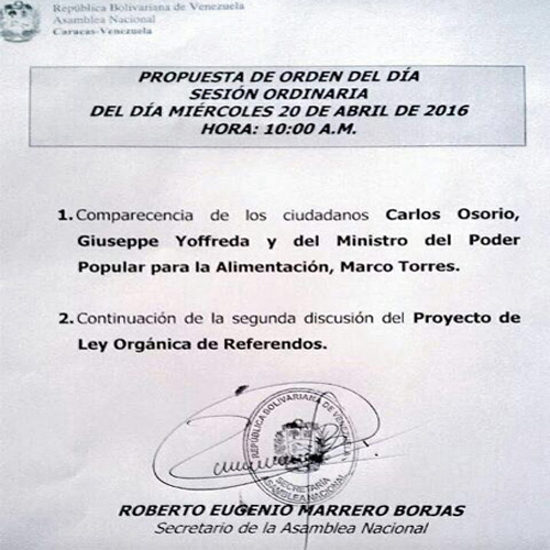 No se descarta que al iniciarse la Sesión Ordinaria de este miércoles 20 de abril se modifique el Orden del Día a objeto de incluir otro tema de sumo interés para los venezolanos.