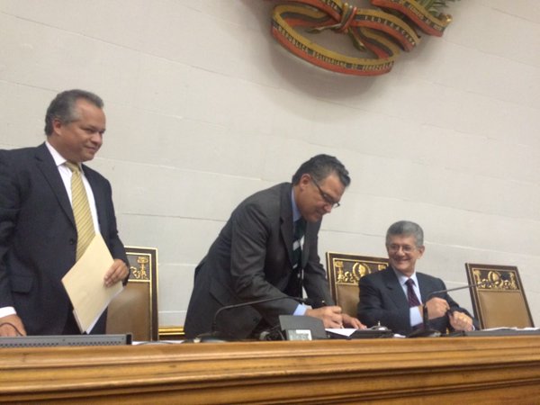 El subsecretario de la Asamblea Nacional (AN), José Luis Cartaya fue el encargado de encabezar la comisión opositora integrada por los diputados Juan Requesens, Tomás Guanipa y el secretario de la Mesa de la Unidad Democrática (MUD), Jesús “Chúo” Torrealba, quienes retiraron las planillas aprobadas por el Consejo Nacional Electoral (CNE) para activar el referendo revocatorio. En la imagen, la Directiva de la AN, durante la sesiòn de este martes. firma la planilla para solicitar el Referéndum Revocatorio.