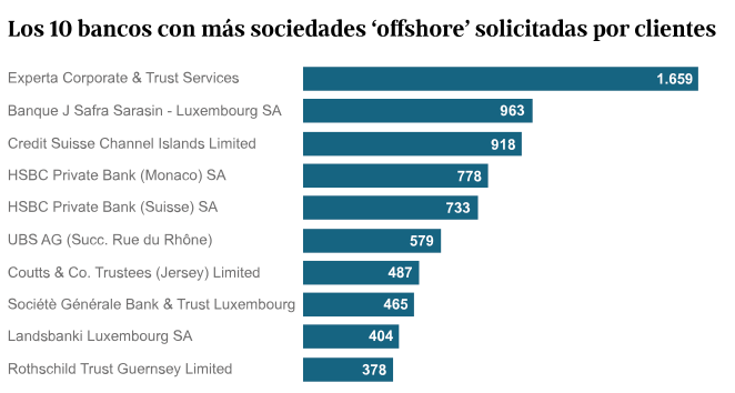 Más de 500 bancos, sus filiales y sucursales registraron casi 15.600 empresas de maletín a través de Mossack Fonseca. La inmensa mayoría de las mismas fueron constituidas a partir de los años 90. El gigante británico HSBC a través de distintas filiales es responsable él solo de más de 2.300 de estas sociedades, y UBS creó 1.100. Otros grandes bancos internacionales que han hecho negocios con este despacho son el francés Société Générale, (979 sociedades), Royal Bank of Canada (RBC) (378), el alemán Commerzbank (92) y el también suizo Credit Suisse.