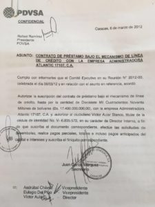 El 6 de marzo de 2012, el Comité Ejecutivo de Pdvsa autorizó la operación con la empresa privada Administradora Atlantic 17107, CA., y comisionó a Víctor Aular Blanco, director interno, «a suscribir y concretar el acuerdo, efectuar las solicitudes de desembolso, realizar los pagos parciales y totales e incluso los pagos anticipados del capital e intereses», según se aprecia en la comunicación confidencial que recibió Ramírez firmada por los vicepresidentes Asdrúbal Chávez y Eulogio Del Pino , así como por el propio Aular. (En la gráfica)