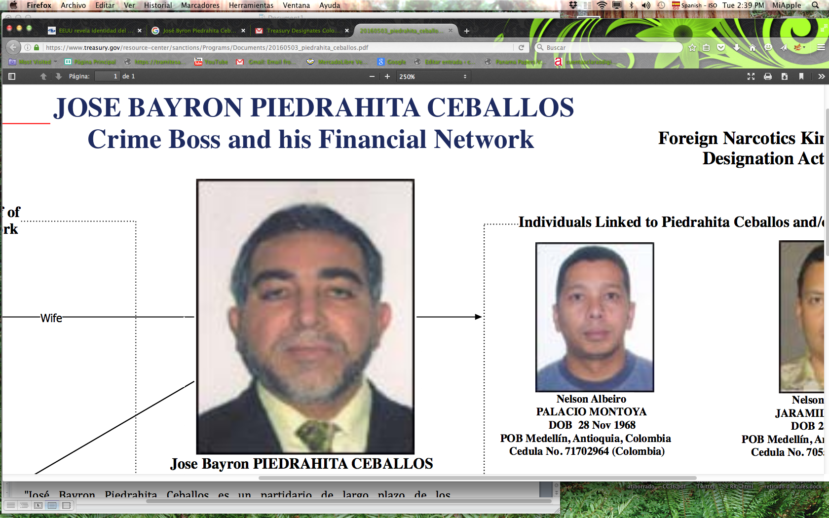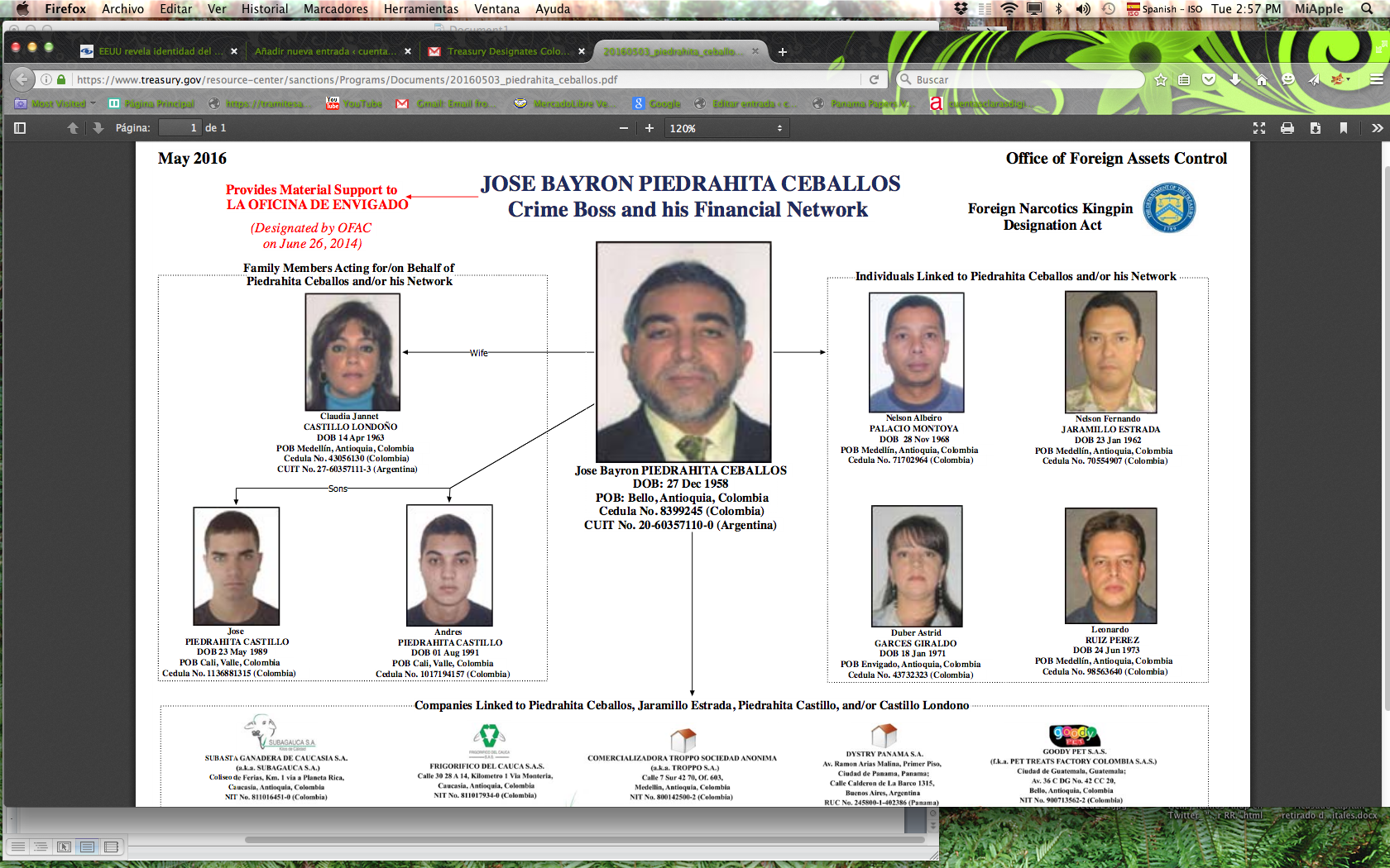 Screen Shot 2016-05-03 at 2.39.18 PMWashington | La Oficina de Control de Activos Extranjeros  (OFAC, por sus siglas en inglés ) del Departamento del Tesoro sancionó hoy al colombiano José Bayron Piedrahita Ceballos, de conformidad con la Ley de Designación de Cabecillas Extranjeros del Tráfico de Drogas (Kingpin Act, por sus siglas en inglés).