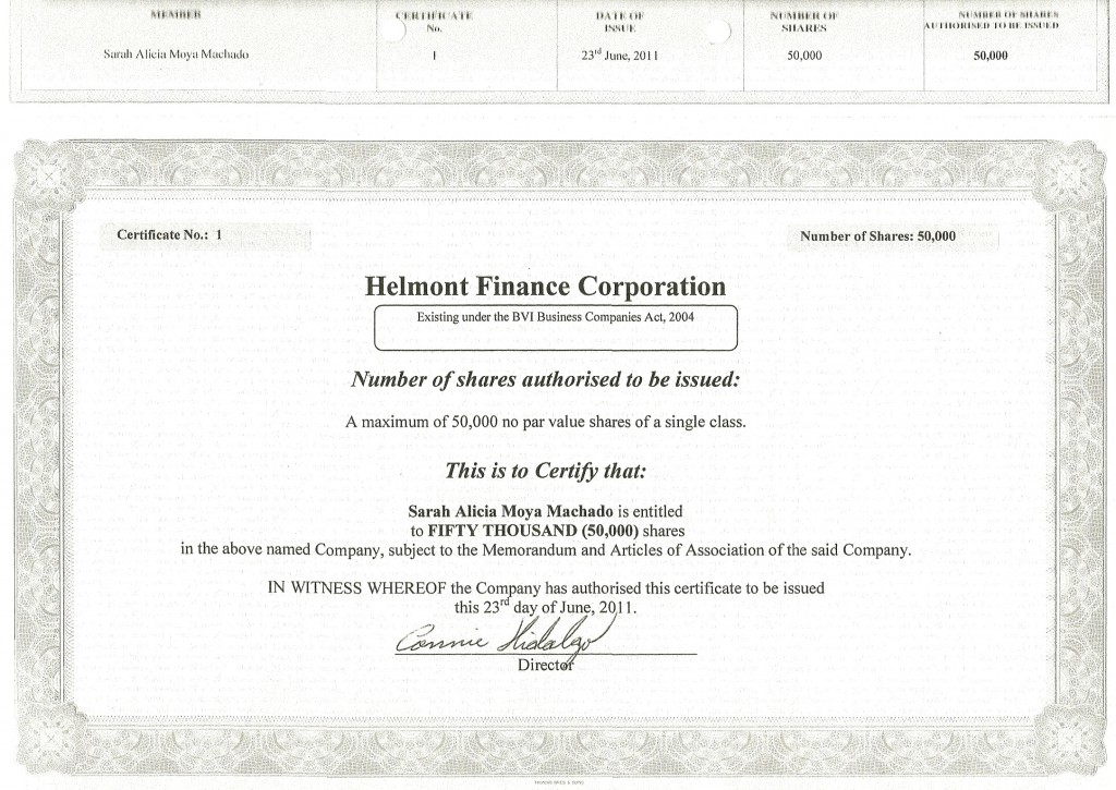 Helmont Finance Corporation se constituyó en Islas Vírgenes Británicas el 23 de junio de 2011. Desde el inicio del procedimiento Moya fue representada por una abogada de origen colombiano llamada Natalia Mulford, quien entonces trabajaba en Panamá para la firma Family Council Wealth Consulting Planning (FCWCP), fundada en Bogotá por el experto en asesoría de empresas en temas sucesorales, Raúl Serebrenik.