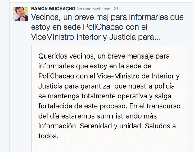Por su parte, el alcalde Ramón Muchacho informó vía Twitter que se encuentra en el lugar para garantizar la operatividad de la policía de este municipio.