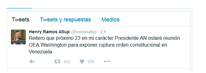 El presidente de la Asamblea Nacional, diputado Henry Ramos Allup (Unidad- Dtto. Capital), estará ejerciendo un derecho de palabra ante la Organización de Estados Americanos (OEA) en Washington, para exponer la terrible situación de Venezuela.