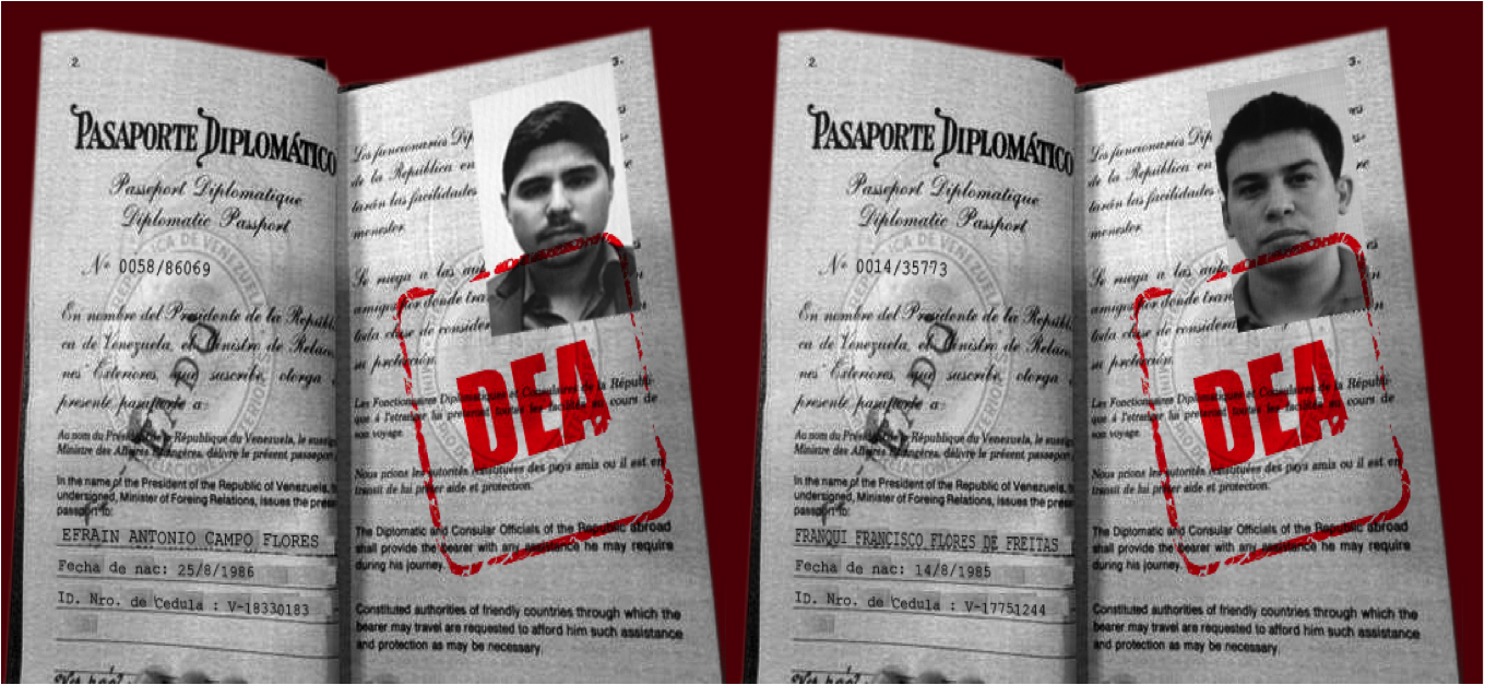 Los sobrinos de la pareja presidencial de Venezuela, Efraín Antonio Campo Flores y Franqui Francisco Flores de Freitas, usaron pasaportes diplomáticos emitidos por la Cancillería de Venezuela para viajar a los países donde presuntamente conspiraron para traficar cocaína. Entre los destinos: Puerto Príncipe, Tegucigalpa, Miami, Fort Lauderdale, Madrid, Ciudad de Panamá, Bogotá y Medellín.