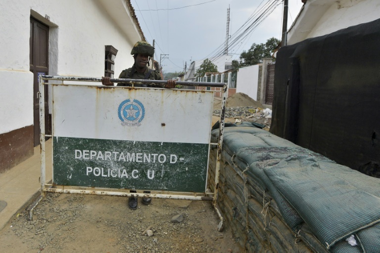 Un policía colombiano en un puesto de vigilancia en Caloto, en el departamento de Cauca, el 28 de agosto de 2016, horas antes de que entrase en vigor el alto el fuego definitivo de las FARC con el Gobierno colombiano, Foto AFP / Luis Robayo