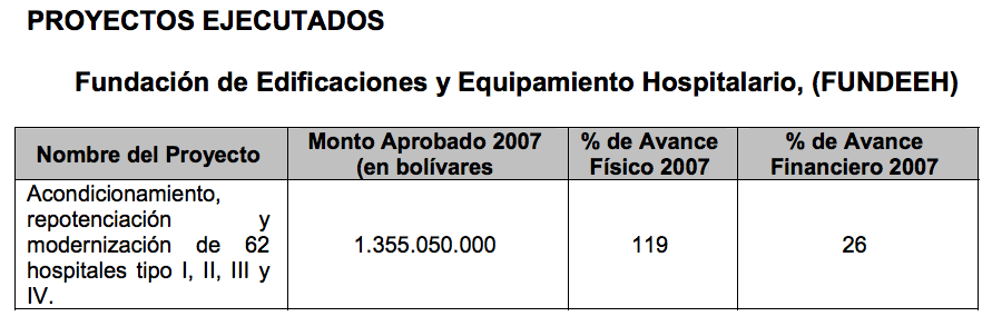 En la Memoria y Cuenta de 2007 del Ministerio aparecieron los resultados de aquella inversión. La Fundeeh explicó que, del monto aprobado, la Oficina Nacional de Presupuesto (Onapre) sólo transfirió Bs. 691.075.500 (321 millones de dólares*) , poco menos de la mitad de lo que se le concedió. Pero, además, mostró un cuadro escueto y sin detalle para exponer los avances. ¿Pudieron los adelantos físicos de las labores alcanzar 119% en lugar de 100%, como sería lo correcto? ¿Pudo hacerse esto con apenas 26% de los recursos financieros disponibles?