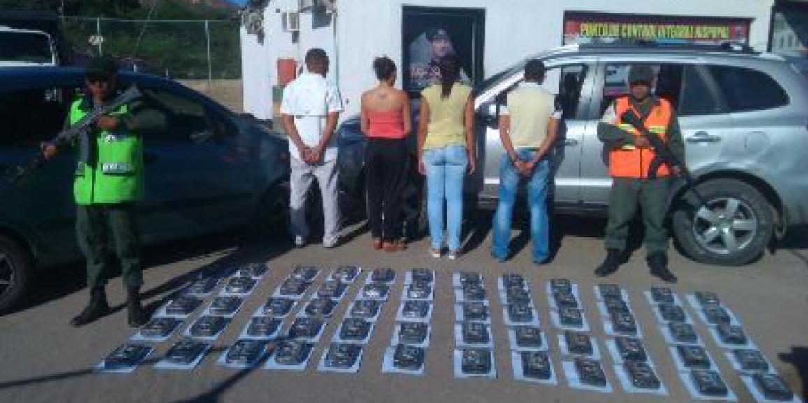 Efectivos del del Destacamento 122 de la Guardia Nacional Bolivariana en el estado Lara, al mando del Capitán Mark González lograron decomisar un total de 60 panelas de presunta cocañina, cuando se encontraban haciendo el chequeo de personas y vehículos en un punto de control ubicado en el sector La Turturia en la carretera vieja Carora-Barquisimeto y procedieron a revisar dos vehículos donde se trasladaban cuatro adultos y tres niños.