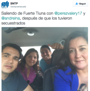 te jueves los periodistas Andreina Flores y José Luis Pérez Valey fueron retenidos por efectivos de la Guardia Nacional Bolivariana (GNB) e interrogados en la sede militar de Fuerte Tiuna por funcionarios de la Dirección de Contrainteligencia Militar (DIM). En la imagen, la abogada Rocío San Miguel con los periodistas, luego de su retención en Fuerte Tiuna.
