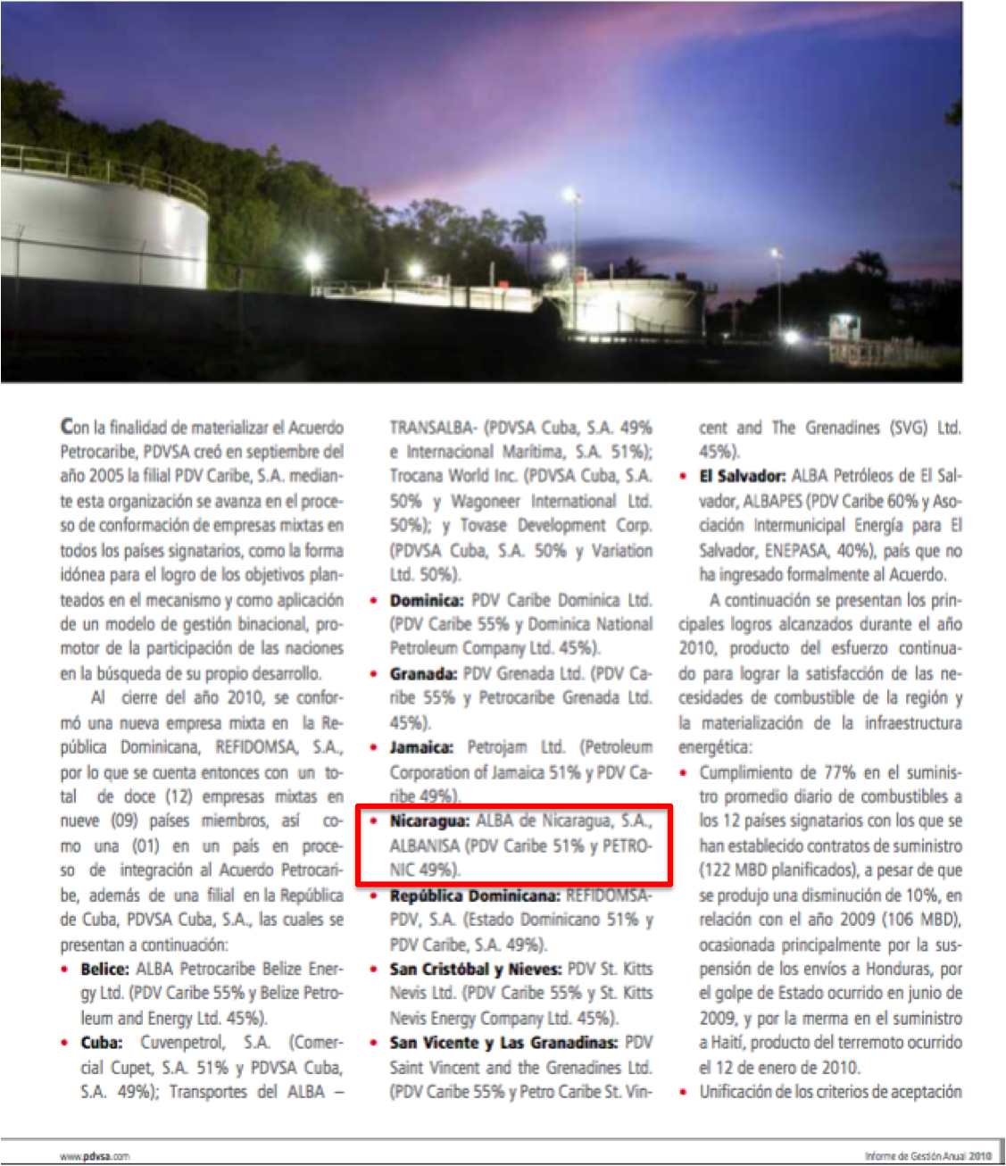 Petróleos de Venezuela (DVSA) creó en el año 2006, durante la presidencia de Hugo Chávez Frías. la filial PDVSA América para la ejecución de los convenios bilaterales y multilaterales suscritos con otras naciones Latinoamericanas y del Caribe. Entre los cuales figura el suscrito con Nicaragua, entre Alba de Nicaragua Sociedad Anónima (Albanisa) y PdvCaribe, como lo indica el cuadro copiado de una publicación de la web de Pdvsa.