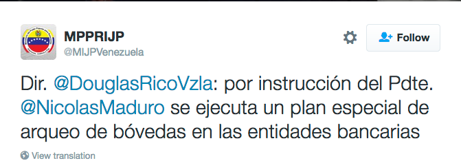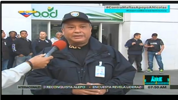 “Cumpliendo con instrucciones del presidente Nicolás Maduro y el Ministro para las Relaciones Interiores, Justicia y Paz, Néstor Reverol, estamos desplegados aquí junto con Sudeban y la Guardia Nacional Bolivariana para comenzar el plan de arqueo en instituciones públicas y privadas, haciendo supervisión y constatando el dinero que se encuentra en las bóvedas”, expresó Rico.