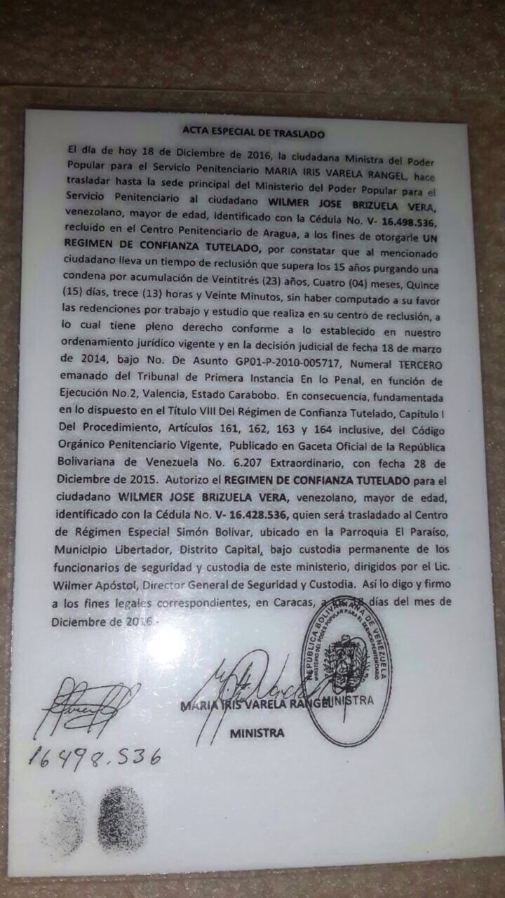 Sin embargo, un documento que circuló en las redes sociales, con el título de acta de traslado, confirma que el domingo 18 de diciembre de 2016, Wilmer Brizuela recibió un beneficio de Régimen de Confianza Tutelada, que otorga la ministro de Servicio Penitenciario. Esta medida de libertad condicional autorizaba su traslado al centro de régimen especial Simón Bolívar, ubicado en Caracas. Pero considerando el poder del pran, no es descabellado que su destino hubiera sido su tierra natal: el estado Bolívar.