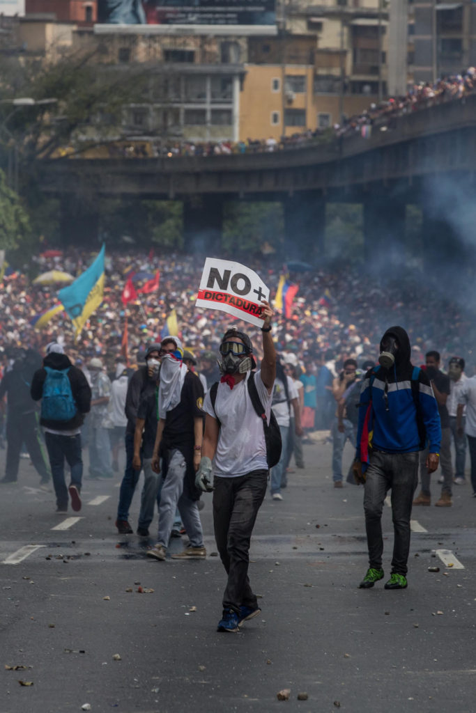 En la línea de choque estaba el vicepresidente del Parlamento, Freddy Guevara, sin máscara de gas, pidiendo a los manifestantes que avanzaran sin lanzar piedras.