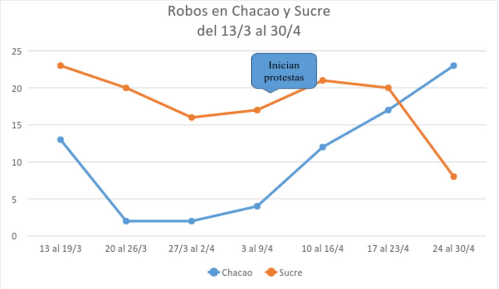 En Chacao, principal escenario de las manifestaciones, ocurren circunstancias que han propiciado un aumento de los robos. En el municipio Sucre hubo un comportamiento similar, aunque no en la misma magnitud que en el municipio vecino. Sin embargo, en la última semana de abril hubo una baja sensible en las denuncias de este delito.