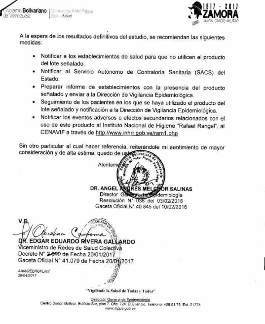 A raíz del informe del Hospital Vargas, la Dirección General de Epidemiología emitió una comunicación (ver imagen) el 28 de abril que ordena suspender el uso de la solución al 0.9% de marca Meheco perteneciente al lote 3B160528 utilizada para tratamientos endovenosos, tal como indica el oficio que llegó a nuestras manos.
