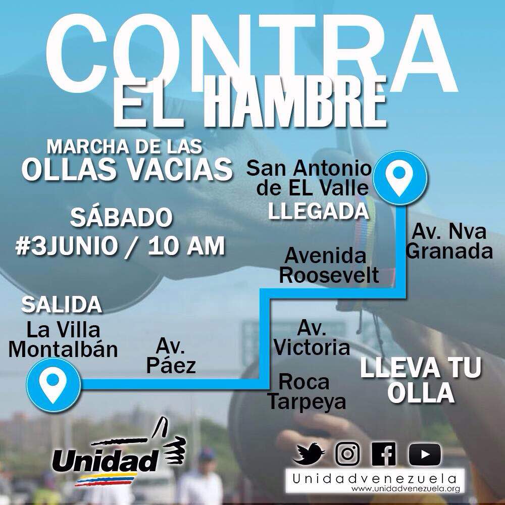 El diputado de la Asamblea Nacional, Richard Blanco, quien este viernes fue el vocero de la Unidad, explicó que la manifestación saldrá a partir de las 10:00 am desde el Centro Comercial La Villa en Montalbán para dirigirse hasta el destino final en San Antonio de El Valle, donde como otras zonas del oeste de Caracas han resultado muy afectadas por la falta de alimentos. Exhortó a los habitantes de los sectores populares adyacentes a salir de sus casas y esperar la movilización en ese lugar para rechazar también la fuerte represión de la que ha sido víctima la población de El Valle por parte de las fuerzas de seguridad del Estado.