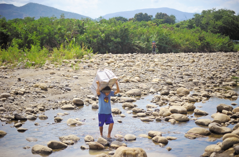 Uno de ellos lleva unas cajas blancas, parecen neveras de icopor muy pesadas. Camina descalzo sobre las rocas por las que pasa un hilo de agua del río Zulia. Intenta no perder la concentración ni el equilibrio. No lo logra. Lo que sea que está llevando se le cae. Suelta un madrazo. Con mucha dificultad recoge la mercancía y después de secarse el sudor y soltar una bocanada de oxígeno, continúa caminando después de escuchar el silbido que alguien, del otro lado de la espesa vegetación, le envío a manera de señal. Así es como se avisan que no hay policías, que coronaron, que pueden seguir el camino.