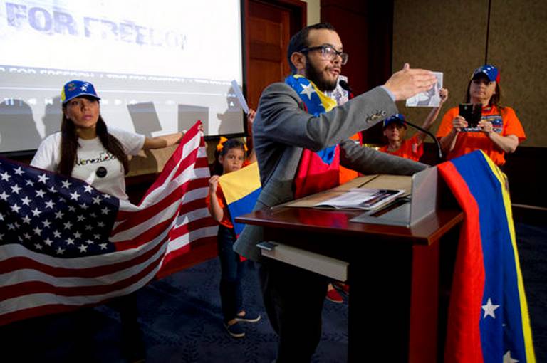 ARCHIVO – En esta fotografía de archivo del 9 de mayo de 2014, Gabriel Jiménez se dirige a los venezolano-estadounidenses durante un evento para presionar al gobierno de Barack Obama con el fin de que sancionara al gobierno del presidente venezolano Nicolás Maduro, en el Capitolio en Washington. En 2018, Jiménez se convirtió en un alto estratega del lanzamiento del petro, la moneda virtual respaldada por el gobierno de Venezuela, y ahora su ex jefa, la republicana Ileana Ros-Lehtinen, cree que él o cualquier otra persona detrás del petro también deberían ser sujetos de sanciones. Manuel Balce Ceneta, archivo AP Foto