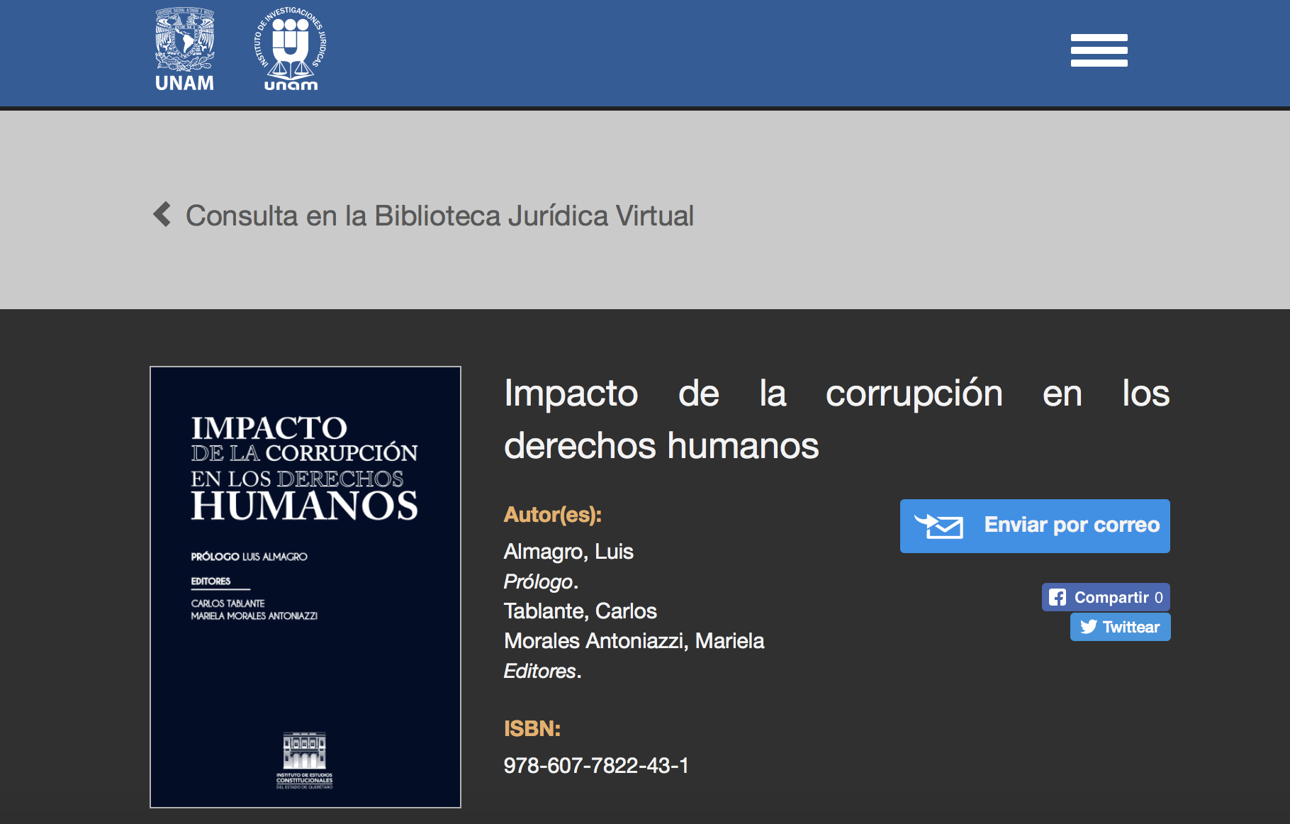 Acceda gratuitamente al texto completo Impacto de la Corrupción en los Derechos Humanos en la Biblioteca Jurídica Virtual de la Universidad Nacional Autónoma de México (UNAM) a través del siguiente enlace: