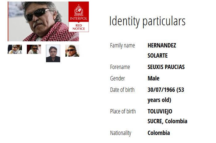 El nombre real del ex guerrillero es Seuxis Paucias Hernández Solarte, quien es solicitado por los delitos: concierto para delinquir agravado y tráfico, fabricación o porte de estupefacientes agravado. La circular presenta cinco fotografías suyas.