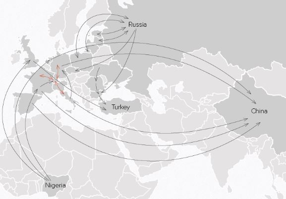 Pero Europol señala que Suiza es el principal país en términos de movimientos tanto entrantes como salientes. Rusia también es un país de origen y destino, y Turquía desempeña un papel crucial en el tránsito de efectivo hacia Oriente Medio. China es un destino principal y Nigeria es un país de origen destacado.