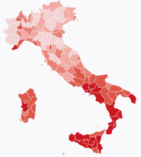 Un estudio piloto de Transcrime-UCSC encontró diferencias notables en el riesgo de lavado de dinero entre las regiones de los tres países de la UE analizados. Existe un alto riesgo, marcado en rojo más oscuro, en muchas de las provincias del sur de Italia.