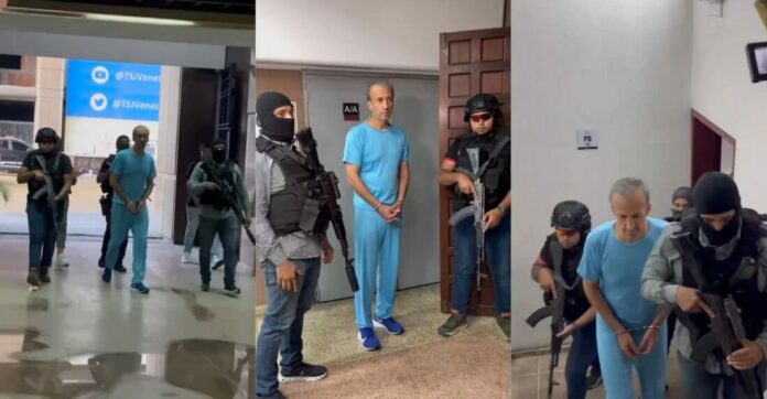 Fotografías y videos difundidos por la prensa en redes sociales mostraron a los imputados al entrar al Palacio de Justicia en Caracas, vestidos con ropa de presidiario azul y esposados, escoltados por agentes armados con fusiles.