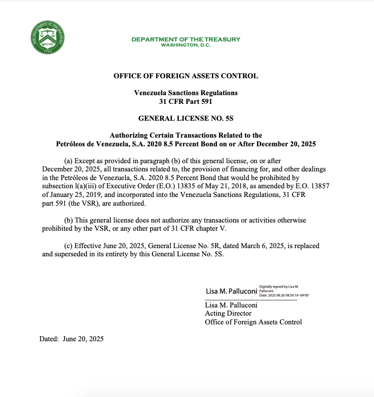 El Departamento del Tesoro de Estados Unidos, a través de la Oficina de Control de Activos Extranjeros (OFAC), emitió el pasado 20 de junio de 2025 la Licencia General No. 5S, firmada por la directora interina Lisa M. Palluconi. Esta nueva disposición autoriza, de forma específica, transacciones, financiamiento y otras operaciones relacionadas con el bono emitido por Petróleos de Venezuela, S.A. (Pdvsa) con vencimiento en 2020 y una tasa de interés del 8,5%. Sin embargo, la autorización solo entrará en vigor a partir del 20 de diciembre de 2025. Con información de AFP.