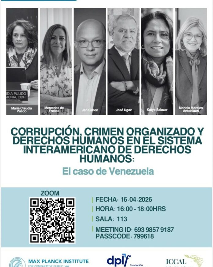 El evento, organizado por el Max Planck Institute for Comparative Public Law and International Law, la Fundación para el Debido Proceso (DPLF) y ICCAL, reunirá a especialistas del sistema interamericano, académicos y expertos en justicia transnacional para analizar cómo las redes criminales, la captura institucional y la corrupción en el poder han incidido en el deterioro democrático venezolano.