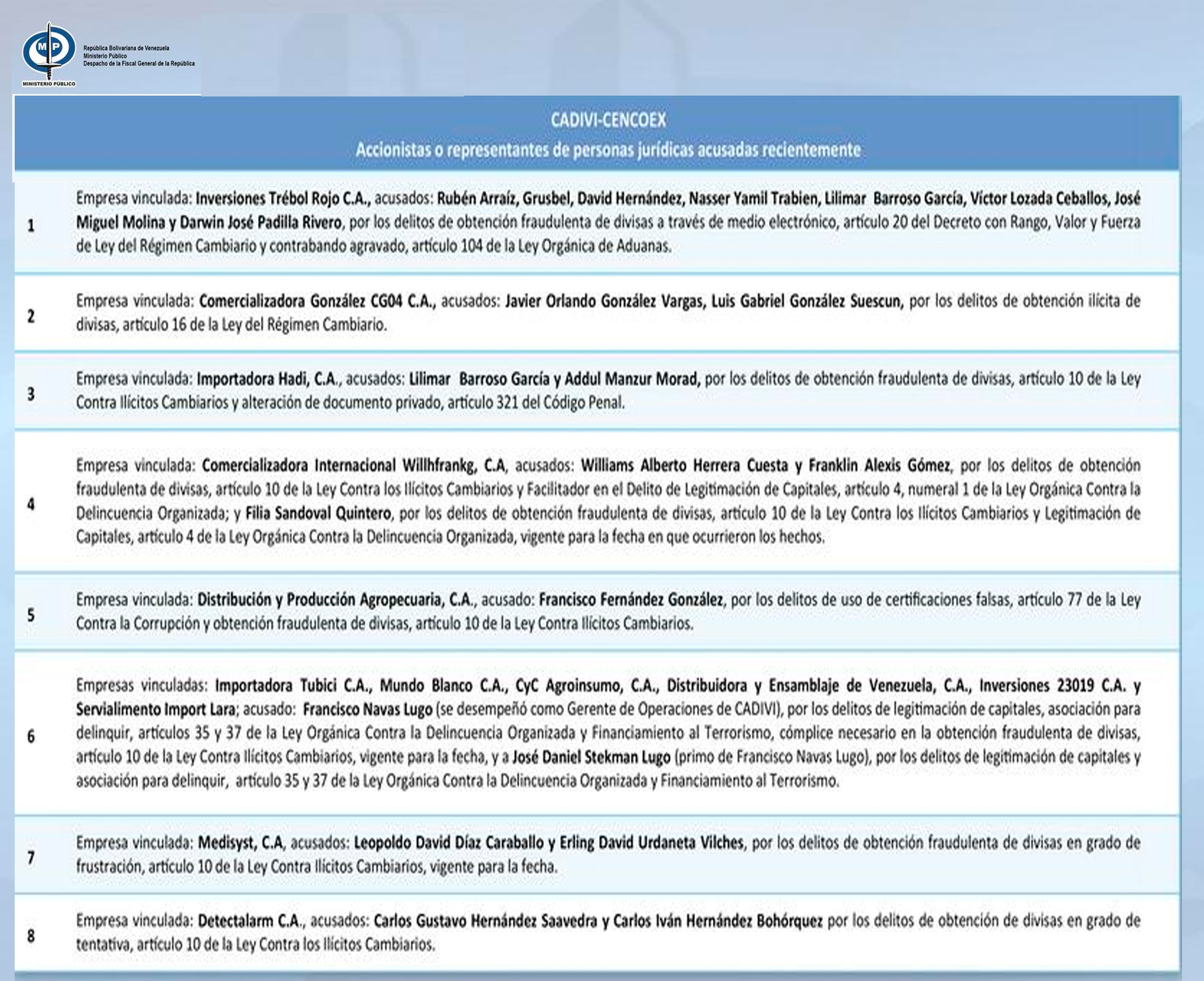 A mediados de agosto, la jefe del Ministerio Público reveló otra lista de 21 personas, representantes de 13 empresas, que fueron acusadas por el Ministerio Público por la presunta obtención fraudulenta de divisas otorgadas por parte de la extinta Comisión de Administración de Divisas (Cadivi), Cadivi. (VER LISTA)