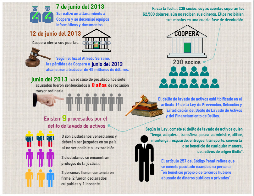 Las pruebas obtenidas por la Fiscalía ecuatoriana evidenciaron que en esta entidad financiera se cometieron delitos de peculado (corrupción) y de legitimación de capitales (lavado de activos), lo que condujo al cierre de Coopera en junio del 2013, cuando contaba con alrededor de 130.000 socios.